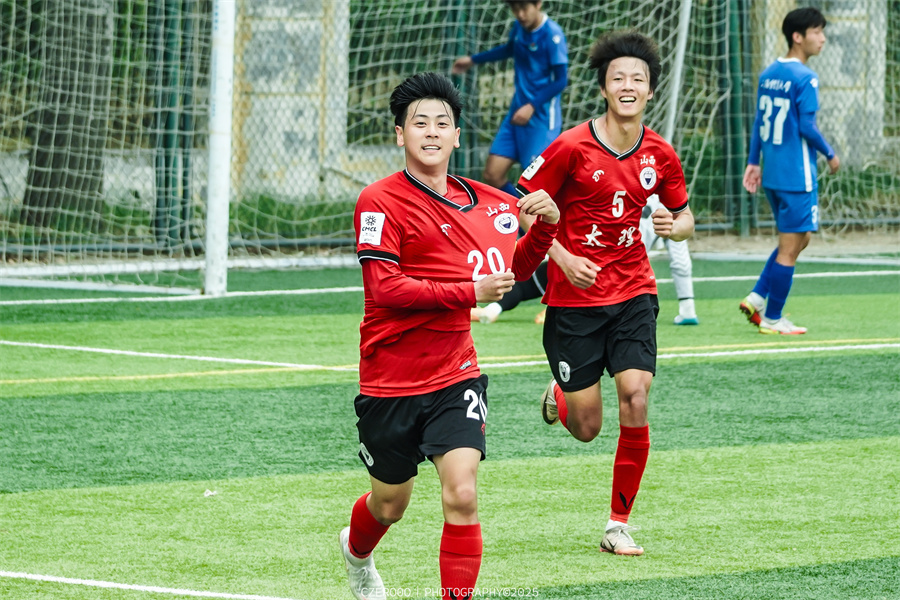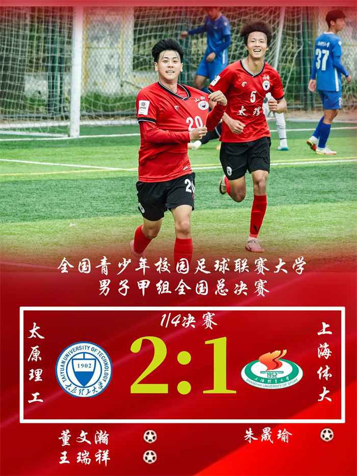 今日,在对阵上海体育大学的比赛中,我校开局不利,被对手头球破门。球队迅速调整,队员们在场上顽强拼搏。第36分钟,我校获得左侧前场任意球机会,28号队员张瑞峰拔脚怒射,造成对方门将脱手,经验丰富的20号队长董文瀚敏锐捕捉战机,门前机敏补射得手,将比分扳为1:1,队员士气大振。下半场,场面激烈胶着,1:1的比分一直保持到常规时间结束。补时阶段,我校队员抓住机会,5号王瑞祥利用角球机会外脚背垫射破门,完成绝杀,球队最终以2:1战胜对手,挺进全国四强。