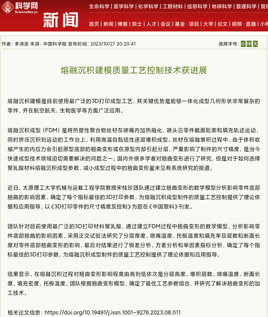 近日,国产亚洲精品美女久久久_99久无码中文字幕一本久道_亚洲成AV人影院_亚洲AV影院一区二区三区 狠狠躁夜夜躁人人爽天天不卡_国产激情久久久久影院老熟女_精品性高朝久久久久久久机械与运载工程学院教授宋桂珍团队通过建立翘曲变形的数学模型分析影响零件底部翘曲的影响因素,确定了每个指标最佳的3D打印参数,为熔融沉积成型制件的质量工艺控制提供了理论依据和应用指导,以《3D打印零件的尺寸精度及控制》为题在《中国塑料》刊发。