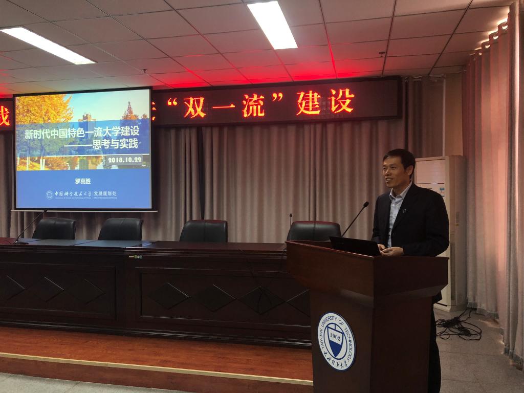 10月22日下午,中国科学技术大学发展和改革办公室主任兼发展规划处处长罗喜胜教授应邀来我校进行工作交流,并在迎西校区逸夫楼701会议室作了题为《新时代中国特色一流大学建设的思考与实践》的报告。本次报告会是山西省政府与中国科学技术大学开展全面合作的系列活动之一,由我校发展规划处负责组织召开,学校各职能处室和直属机构、各学院及重点实验室负责人参加了会议。