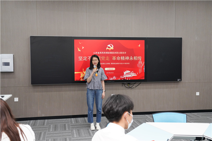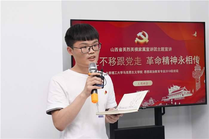两个小时的报告会,由5位家属讲述的5位年青的英烈英模的英雄事迹,2016年执行战备航行飞行任务时在西藏牺牲、年仅40岁的孙历君,2019年病倒在扶贫岗位上、逝世时年仅42岁的常国平,1947年领导学生支援解放运城战役、英勇就义时年仅33岁的何典成,2017年在工作岗位突发疾病、逝世时年仅44岁的李飞,1946年不幸被捕、英勇就义时年仅16岁的马小宝,让师生们上了一堂生动鲜活、发人深省的思政大课,一堂知史爱党、知史爱国的党史大课。