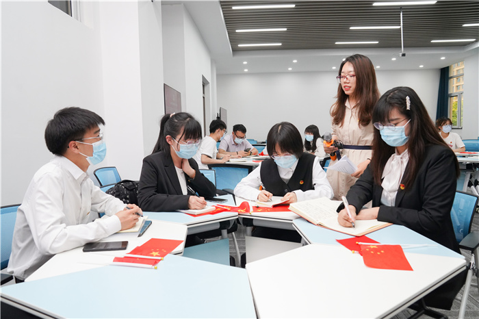 宣讲报告会结束后,马克思主义学院2018级思想政治教育专业20余名学生便聚集在一起,在辅导员贾佳的带领下,召开了一次别开生面的主题班会。大家分组围坐在一起,分享听取报告后的所感、所悟以及自己家乡的红色故事,并进行了小组讨论。“烈士们践行了古诗词中‘男儿何不带吴钩、马革裹尸当自誓’这样的誓言。当主持人说出这句话时,我已是泪眼婆娑。”崔文灏感慨地说。付用超说:“每一位先烈都是一座精神的灯塔,他们的奋斗精神融入了中国共产党的百年精神长河、百年精神谱系,人民会永远记得,我们青年人更要永远记得。”分享结束时,师生们不约而同挥动起手中的国旗和党旗,一起唱响了《没有共产党就没有新中国》,暗下决心,要饮水思源,缅怀英烈,追思先贤,继承遗志,开拓进取,争做有道德、有梦想、有担当的大学生,以实际行动展现新时代大学生的青春风采,为实现中华民族伟大复兴的中国梦努力奋斗。
