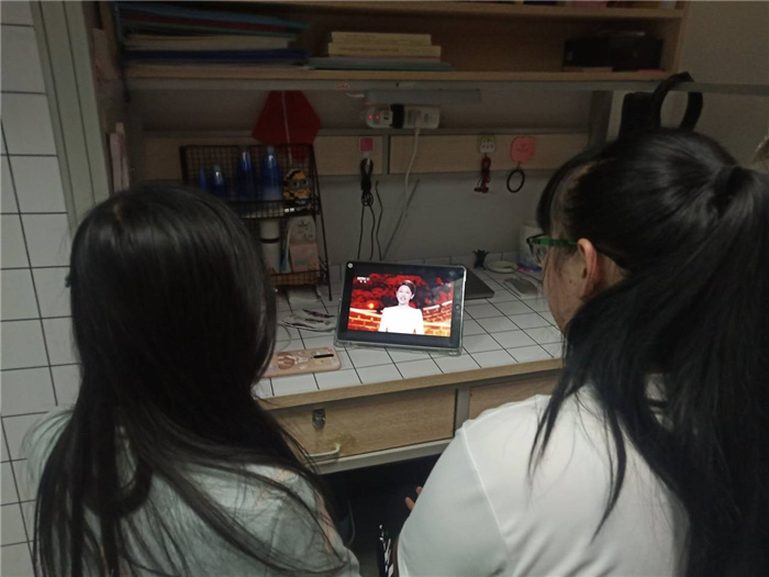 百年恰风华,千人同在线。现场同学们神情专注,反响热烈,不时热泪盈眶。从开国大典的第一面五星红旗升起,到抗美援朝战争人民志愿军打出了山河无恙;从新中国成立初期的扫除文盲活动,到如今教育走上了现代化的发展道路;从李大钊到焦裕禄,从左权将军到雷锋战士,在真实动人的故事中,在感人肺腑的情节片段里,同学们感受着中国共产党带领中国人民一路走来的苦难与辉煌,在党的非凡历程中汲取着前行的力量。在视频播出朗诵《沁园春·雪》时,全体同学也不约而同地跟着朗诵,会场不时爆发出热烈的掌声。