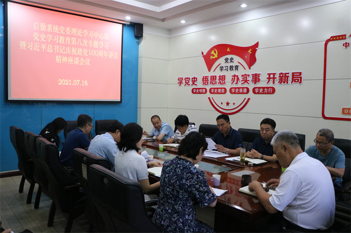 7月16日上午,后勤系统党委召开中心组理论学习扩大会议,进行第八次党史专题学习,就习近平总书记在庆祝建党100周年大会上的讲话精神开展交流研讨。后勤系统党委书记张亚东主持会议,党委班子成员、处级以上领导干部、各支部书记参加会议。