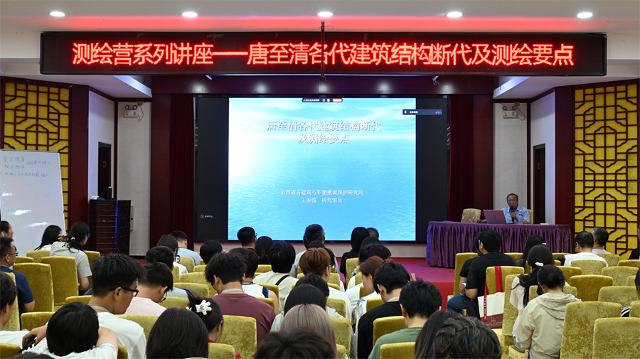 为拓宽学术视野,夯实理论基础,本次工作营特邀多位国内古建筑领域权威专家开设专题讲座,搭建起理论研究与实践操作高度融合的学术交流平台。来自同济大学建筑与城市规划学院、长期深耕山西古建筑调查与研究的博士候选人李竞扬,以《古建筑测绘概说》为题,介绍了我国建筑测绘发展过程,系统介绍了多种测绘方法,强调了在现场绘制测稿的重要性,通过画图强迫自己观察建筑细节。山西省古建筑与彩塑壁画保护研究院王春波研究员围绕《唐至清各代建筑结构断代及测绘要点》展开讲解,结合大量一线案例,深入剖析不同时期山西地区古建筑的结构演变特征与识别要点,指导学生如何根据年代特征把握测绘重点与尺度逻辑。清华大学建筑学院副教授李路珂带来题为《历史建筑测绘的微观与宏观视野》的专题报告,从建筑遗产保护体系的整体格局出发,阐述了测绘工作在文化遗产价值发现、认知与表达中的学术定位。她同时以彩画测绘与色彩调查为例,展示了近年来建筑测绘在技术路径与研究视角上的新趋势,拓展了学生对测绘边界的理解。三场讲座主题鲜明、内容深入,涵盖历史、方法、理念与价值建构等多个维度。讲座现场讨论热烈,师生围绕技术细节、研究方法与测绘成果转化等问题积极发言,展现出良好的学术氛围。