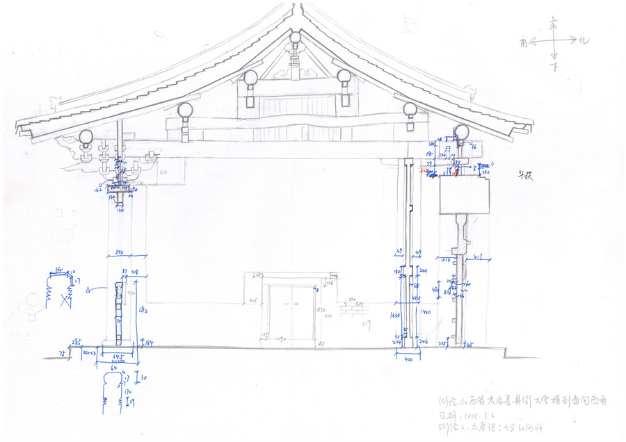 传统建筑测绘培训是本次工作营的核心内容之一。学院师生共分两组,分别对太谷古城内的明代古城县衙与宋代安禅寺进行了为期六天的现场测绘记录。前两日集中进行现场任务布置与基本草图绘制,中段完成主要构件的测量与数据复核,最后两日在确保安全的前提下搭设脚手架,师生佩戴安全绳与安全帽,对斗拱层、梁架层等关键结构部位进行近距离观察、拓印与测量,填补常规教学中难以接触的实践空白,提升学生对古建筑结构与构造形式的理解深度。每日外业工作结束后,各高校师生于酒店会议室围坐交流,联合开展“当日评图”环节。针对各阶段测稿绘制方法、测量方式等问题展开讨论与复盘,推动各校专业交流与认知深化同步进行。